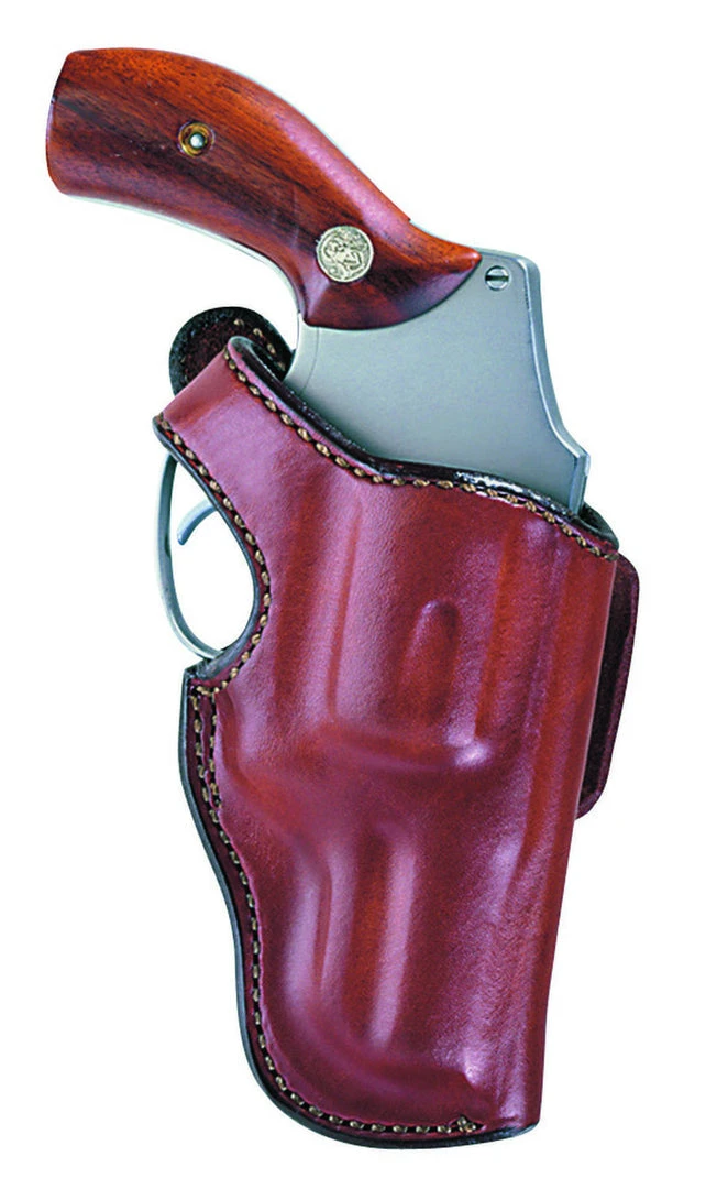 The 55L is a hip holster with an integral finger snap closure for hammer shrouded guns. Security is provided by a retention strap that crosses behind the trigger guard. Release tab is activated by the middle finger during the draw. Full grain, vegetable tanned cowhide. 1.75 in. (45mm) belt loop.