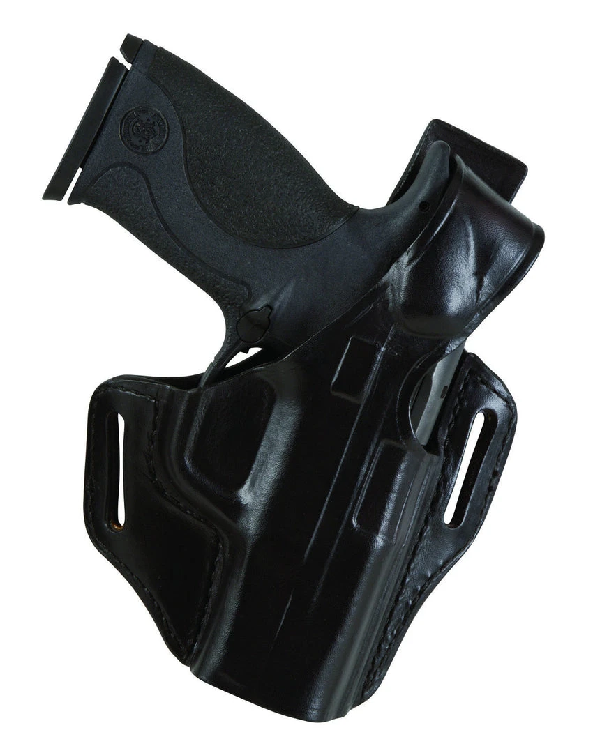 This thumb snap holster for semiautomatics and small frame revolvers is a two-slot design and rides high on the hip and close to the body for excellent concealment. It features a fully molded holster front, giving a beautiful contoured appearance, in addition to being more comfortable to wear. The large rectangular thumb snap is a safety feature, helping to reduce the chance of the snap being caught in the trigger guard. Fits up to 1.5 in. (38 mm) belt width and is available in Plain Tan or Plain Black finish.