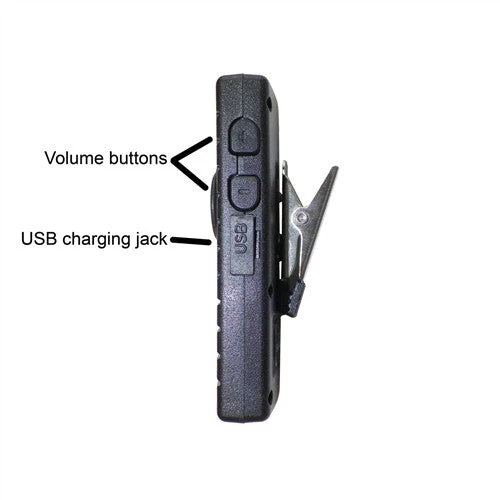Accessory jack enables use of corded Finger Push-To-Talk accessory attachment. Has a rechargeable replaceable battery with an universal micro USB cord and wall charger. One Year Manufacturer Warranty.