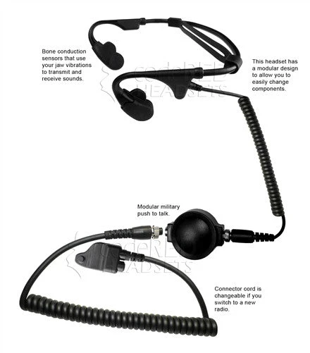 Stay in the game with our lightweight bone conduction headset with military style PTT. The perfect solution for those high noise environments. Bone conduction technology transmits and receives audio directly from vocal vibrations in the skull. The speakers do not block the user’s ears thereby improving situational awareness. Hearing protection can be worn with these. The modular design allows you to easily change components. Works with hearing aids. Compatible with Harris/MaCom radios with a multi-pin connector. 1 year warranty.