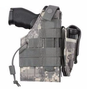 Rothco MOLLE Modular Ambidextrous Holster features a modular design for left or right hand use. The holster also features an elastic cord for securing weapon, 1 single mag pouch for ammunition, 2 removable molle straps, and fits large frame semi-automatic pistols. Multicam version is made from licensed 1000D Cordura nylon fabric.