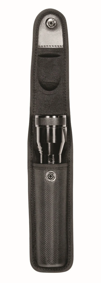 Ballistic Closed Flashlight Case is constructed with 1680 denier ballistic to provide lightweight comfort and durability. Molded design for secure equipment placement and quiet easy in/out access. Hidden snap design offers a professional look and reinforced USA DOT® snaps provide reliable snap/re-snap functionality.