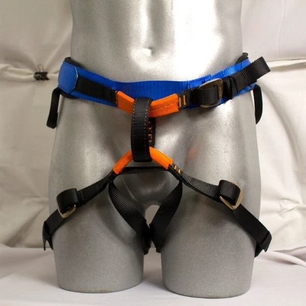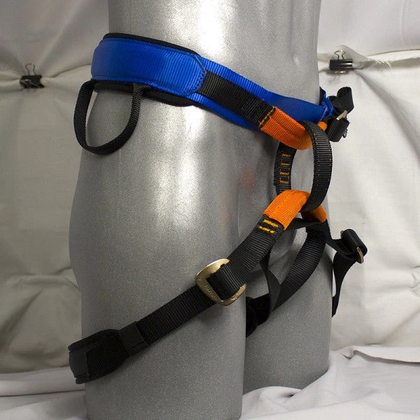Chronus climbing harness with lightly padded waist and legs for comfort and support. Sturdy double back buckles & includes gear loops, one on each side.