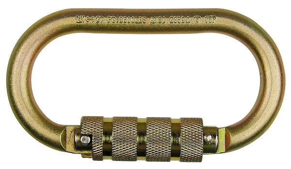 Oval-shaped carabiner decreases the chances of cross loading the gate and distributes the load evenly making it ideal for use with pulleys. Strong and versatile with an alloy steel body & triple locking gate. Meets ANSI Z 359.1-92 standards.