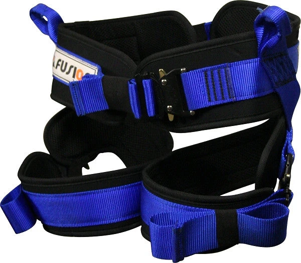 Fully padded waist harness with side attachment points designed specifically for use with bungee trampolines. The reinforced nylon attachment point on each hip is for easy setup. Hook and Loop material on the leg loops and the high strength Presto buckles make the harness very easy to put on and take off quickly. Also available with velour pads for extra comfort.