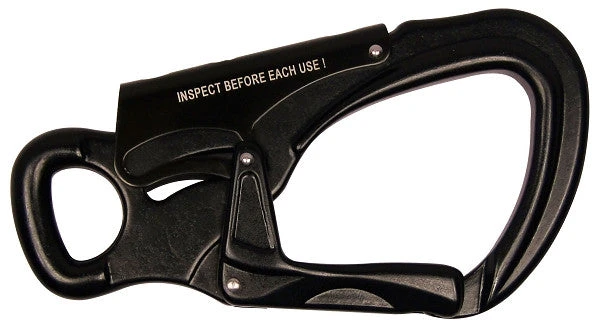 Lightweight aluminum snap hook with captive eye to prevent cross loading the gate. Double locking gate locks automatically and is easily operated with one hand. Super lightweight and easy to use for quick tie ins, smooth gate prevents wear on ropes and harnesses.” Meets ANSI Z 359.1. MBS: 28 KN