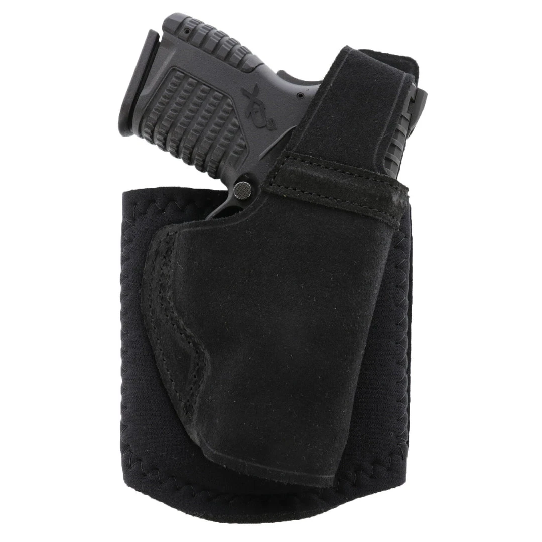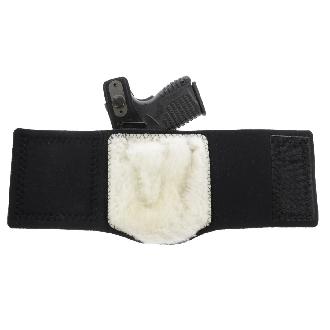 Using the same wide neoprene ankle band and hook-and-loop closure as the Ankle Glove with Center Cut Steerhide™ for the holster, the Ankle Lite combines extended wearing comfort with unmatched security. Additional comfort is provided by sheepskin padding between the holster and ankle, while speed of draw is enhanced with a reinforced thumb break retention strap.