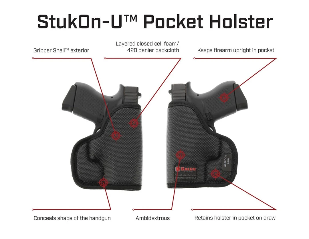 The StukOn-U is designed for front pocket carry in pants or a jacket. Galco’s pocket holsters greatly minimize the handgun from shifting in your pocket, allowing for a sure and quicker grip acquisition when drawing. The holster covers the trigger to prevent entanglement with foreign objects and adds a safety barrier between fingers and trigger when acquiring a grip. It conceals the shape of the handgun so its outline doesnt print through the pocket, and allows one-handed release of the handgun from both pocket and holster.