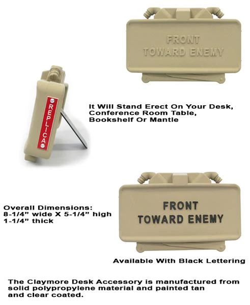 The Claymore Mine Desk Accessory is molded from the real deal, but instead of spikes to hold it erect, it has a small steel easel support in the back, so that it will remain upright on your desk, bookcase or den fireplace mantle. It measures approximately 5-1/4 inches tall by 8 inches wide by 1-1/4 inches thick and is manufactured from solid polypropylene. It is painted desert tan with a matte clear coat applied.