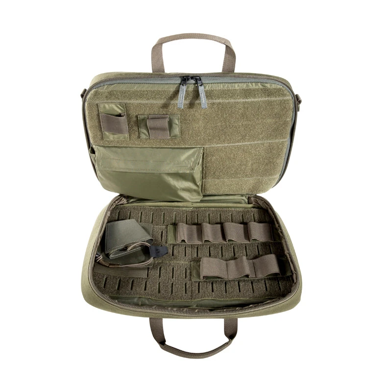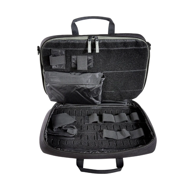 Modular handgun case for two or three weapons. The interior is fully equipped with MOLLE and hook-and-loop storage options. A zippered interior pocket is used for storing a laptop or additional equipment.
