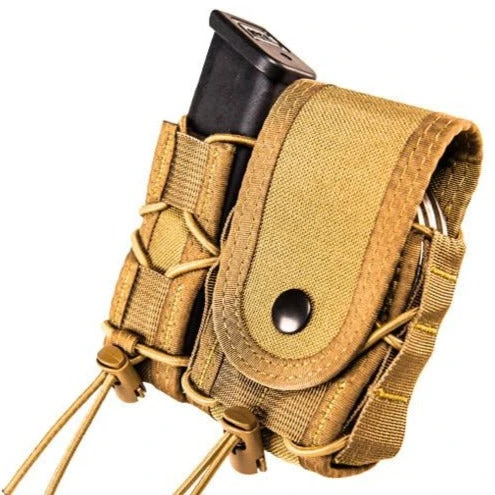 This combination of our Pistol TACO® and Handcuff TACO® – Covered will hold almost any combination of pistol magazines, small flashlights, multitools, handcuffs, field compasses or tins.