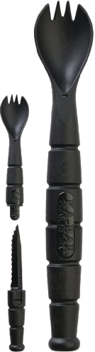 The Field Kit Spork Set is perfect for camping, hiking, picnics, storing in gloveboxes and packs, and eating on the go. Made from food and water safe Creamid®, the Sporks are dishwasher safe. The Sporks feature a spoon/fork combination at the base and a serrated knife internally. The knife is accessed by pulling on both ends of the Spork. The overall length of each spork is 6.875”. The blade length of the knife is 2.5”. Made in the USA.