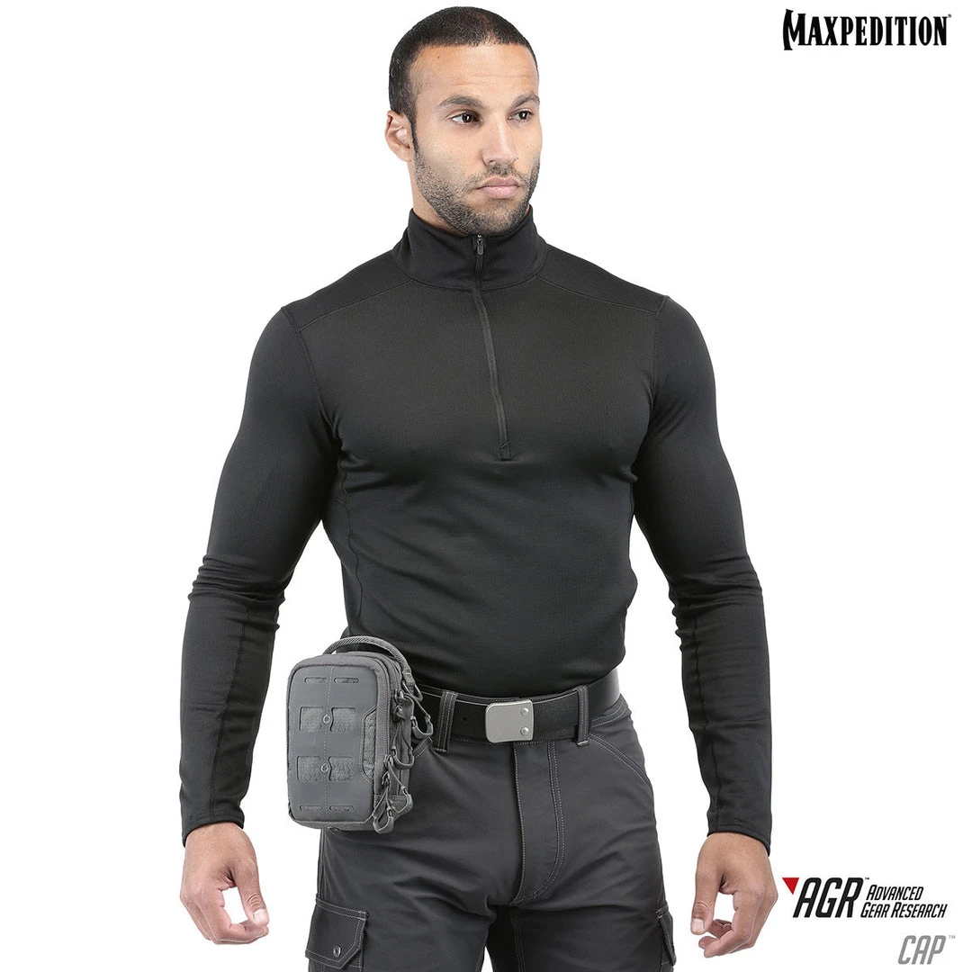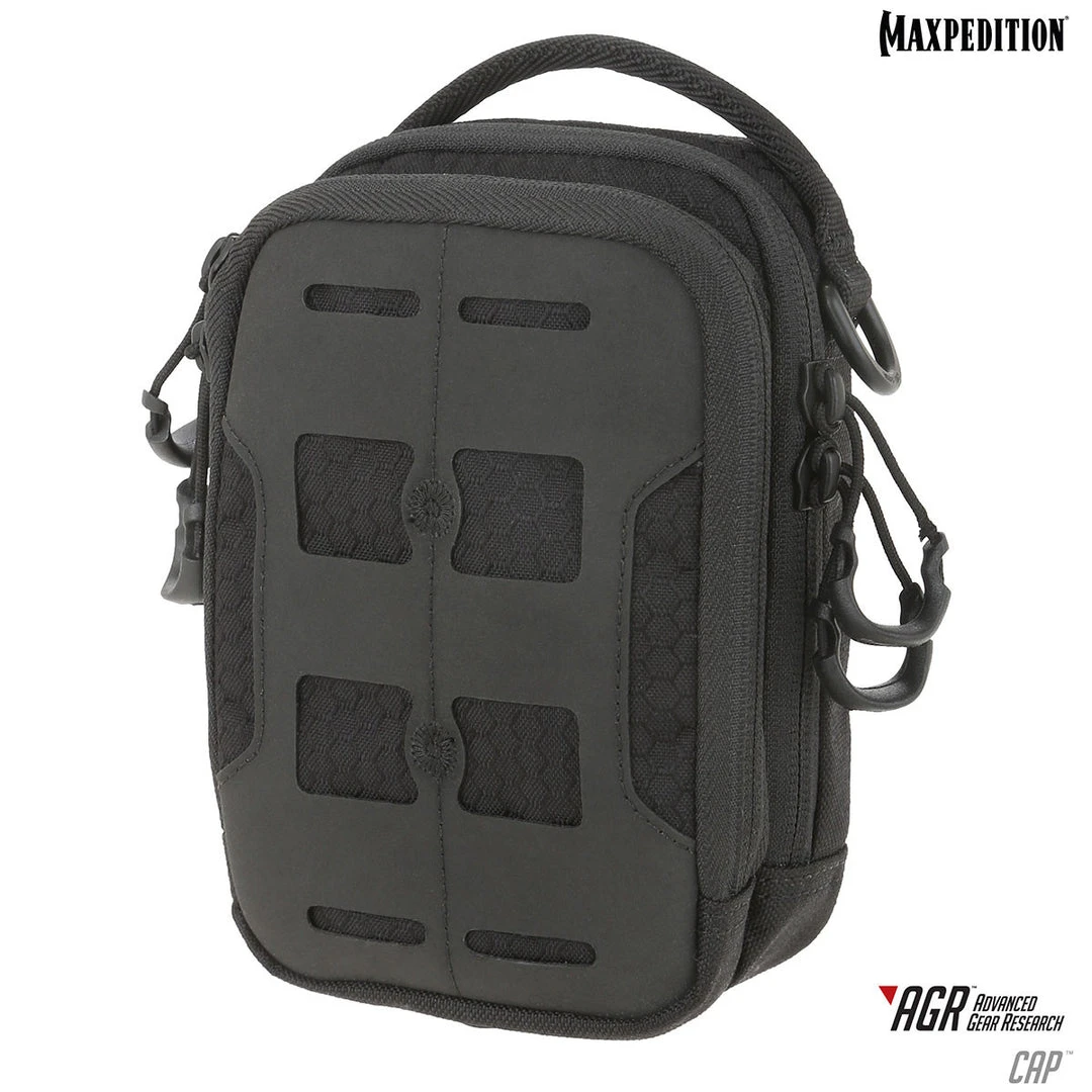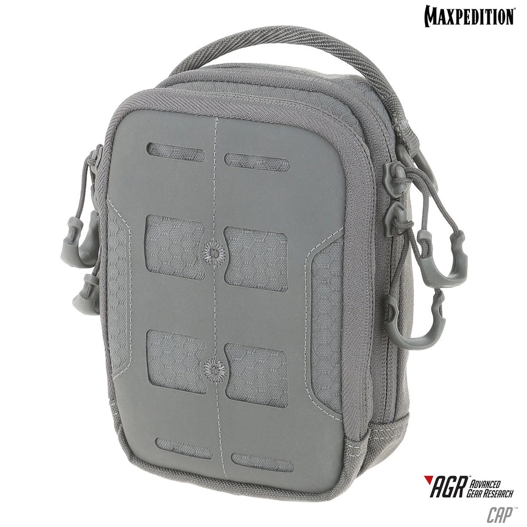 The CAP Compact Admin Pouch is a low-profile pouch when empty, yet expands to fit mission critical items. The front compartment features elastic organizers, an extra pocket, and a plastic keyfob to securely hold key rings. The interior main compartment of the Maxpedition CAP Compact Admin Pouch has a visible grayscale interior, additional elastic organizers and pockets for storage. The CAP also comes equipped with two (2) TacTie PJC5 Polymer Joining Clips for modular attachment to any AGR or legacy pack.