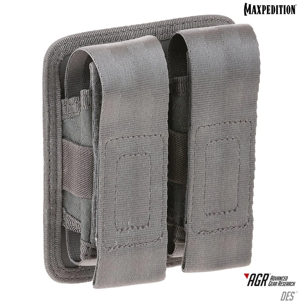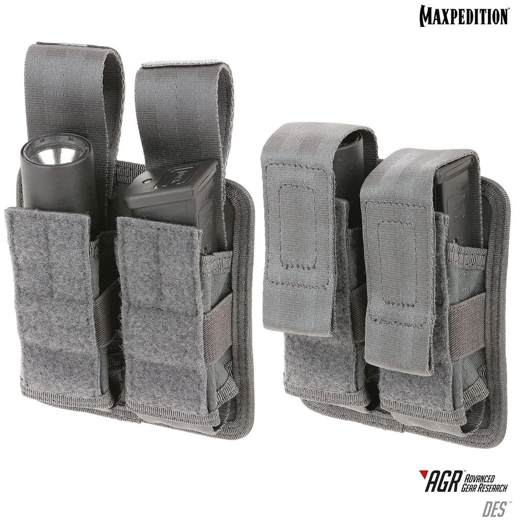 The DES Double Sheath Pouch has a unique design that allows you to pull out the contents with one tug of the webbing tab. Side elastic retention keeps objects secure. Perfect for handgun magazines, flashlights, and/or tools.