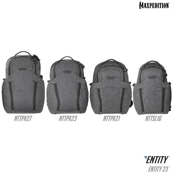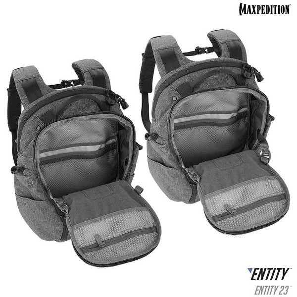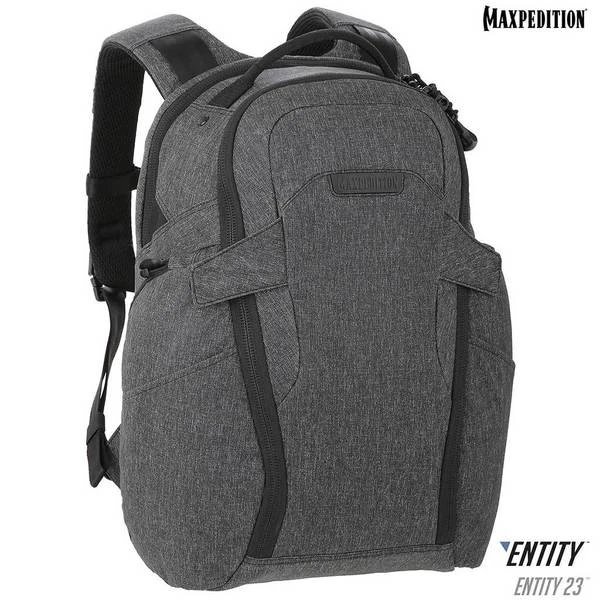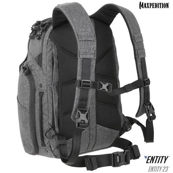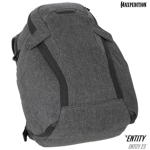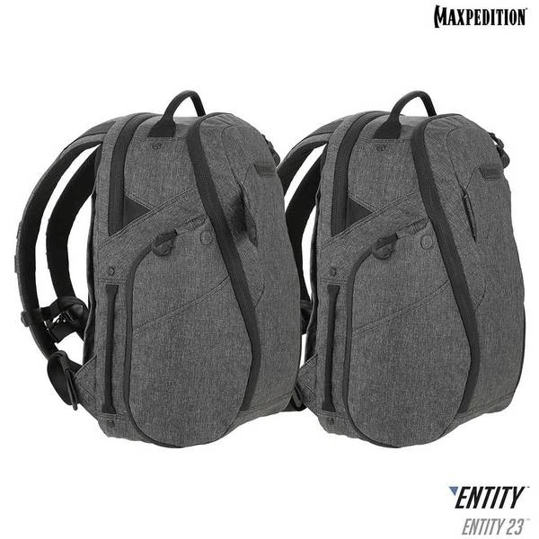 The Entity 23 is an ergonomic pack with padded shoulder straps and quick release buckles. There is a dedicated locking and padded compartment, which can hold a 15€? laptop. The main compartment is also lockable, and has drawbridge straps for additional security. The front exterior has tuckable magnetic wings for quick temporary closing of the main compartment. The dual access rear CCW compartment is fully loop-lined, and a double-sided hook Security Lockout Strip is included. Dual side ports are perfect for headphones, charger cables, etc. A rear trolley handle pass-through allows for off body carrying while travelling.