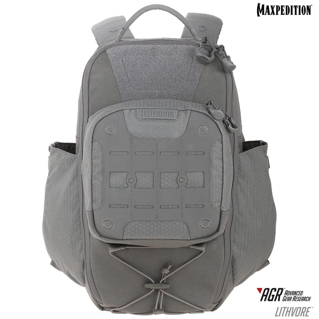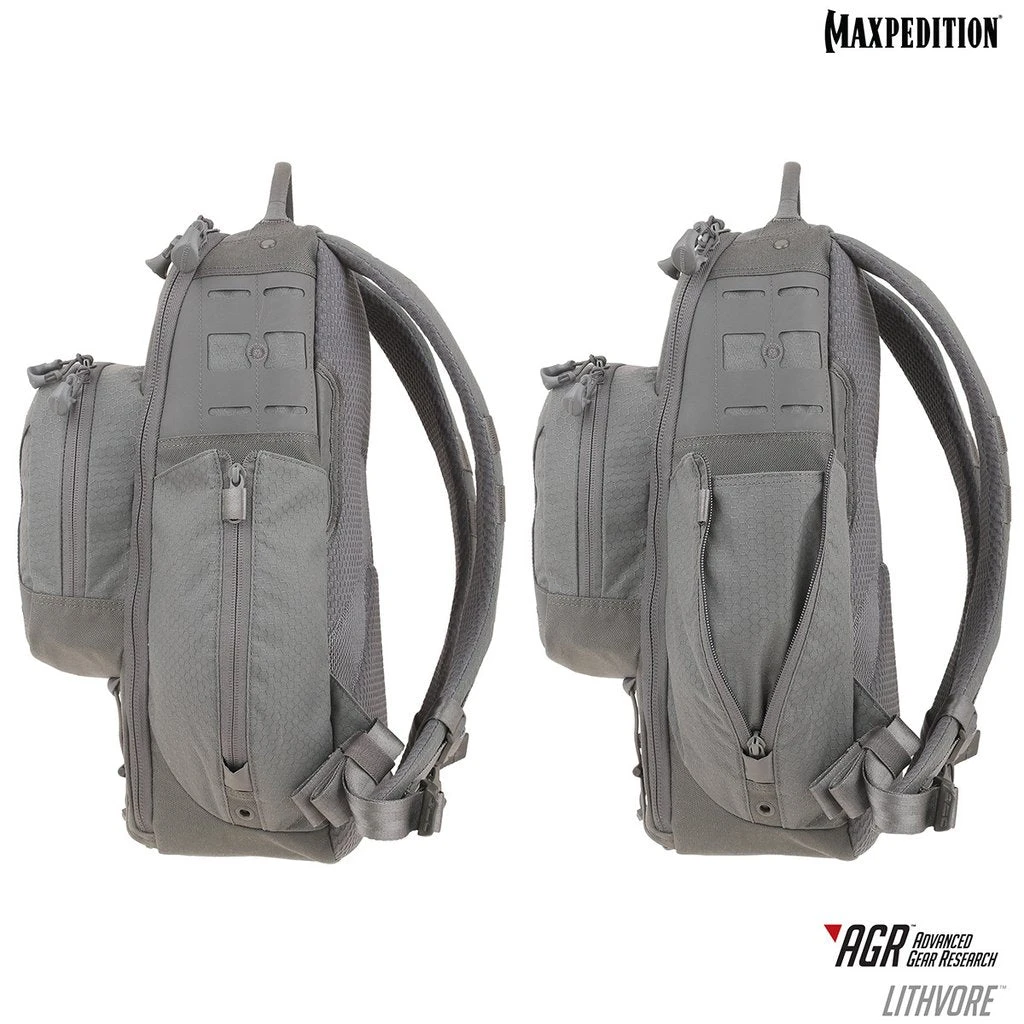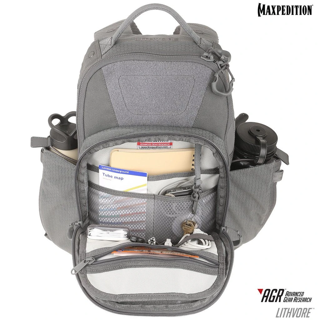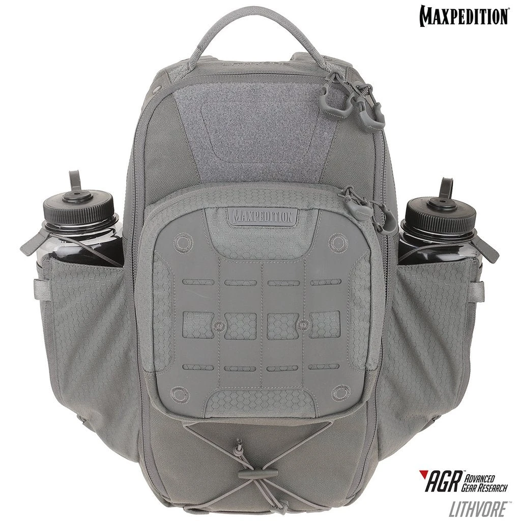 The Lithvore is an ergonomic backpack with padded shoulder straps. There is a top loop field for patch adhesion, a front admin pocket for added organization, a bottom shock cord retention array, two (2) expandable bottle pockets with dual zipper garages, and a fully opening main compartment.
