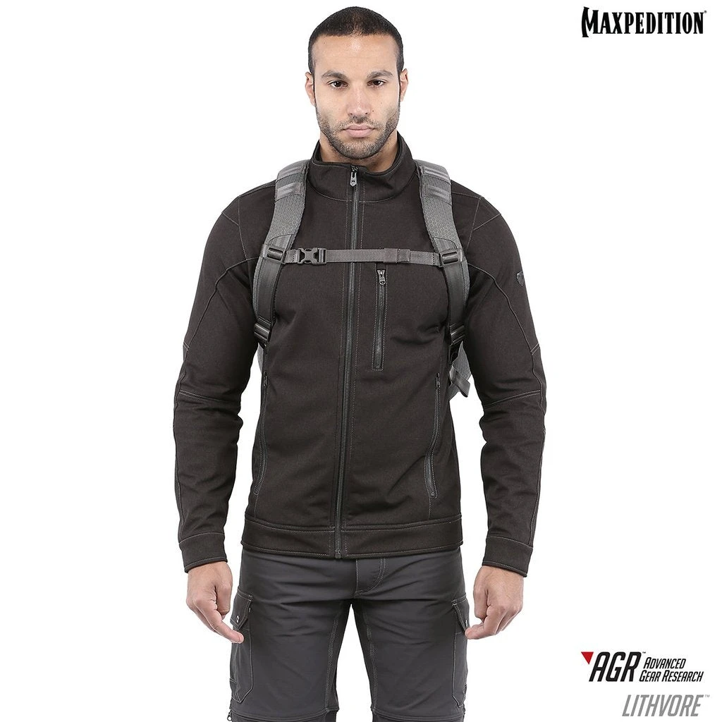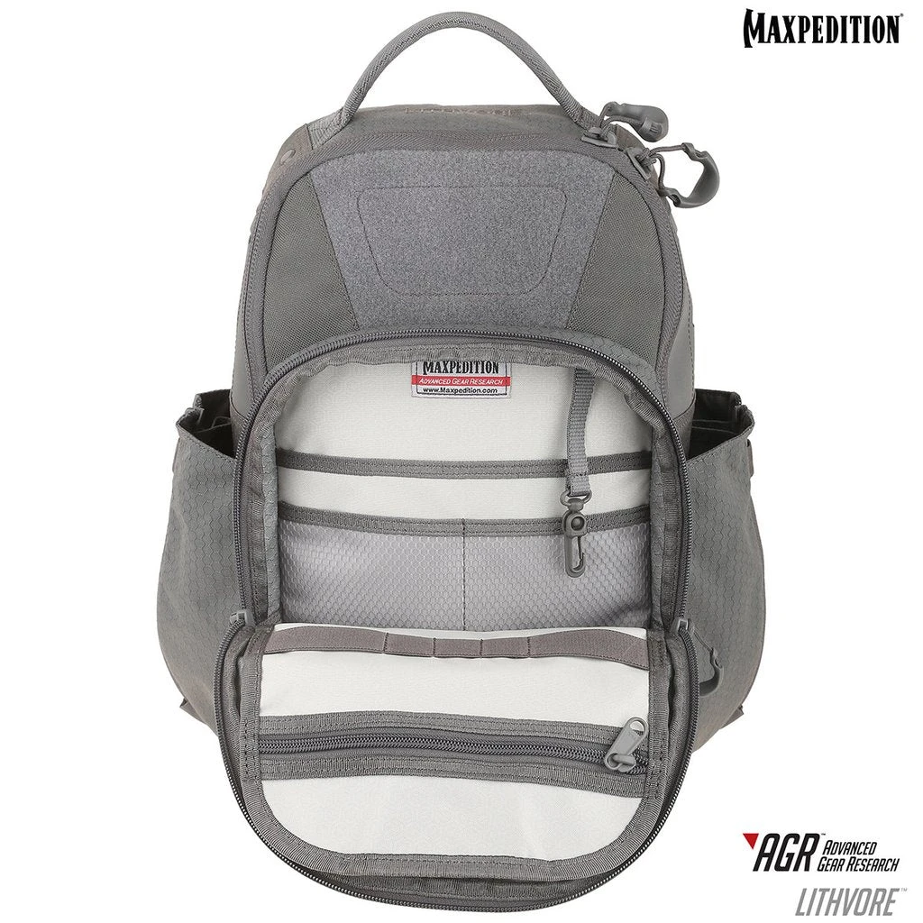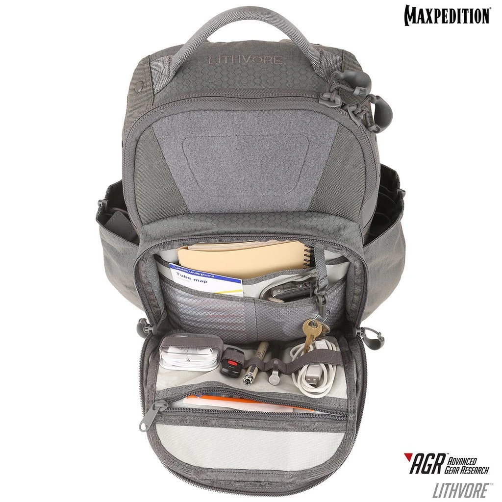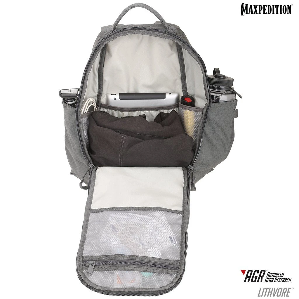 The Lithvore is an ergonomic backpack with padded shoulder straps. There is a top loop field for patch adhesion, a front admin pocket for added organization, a bottom shock cord retention array, two (2) expandable bottle pockets with dual zipper garages, and a fully opening main compartment.