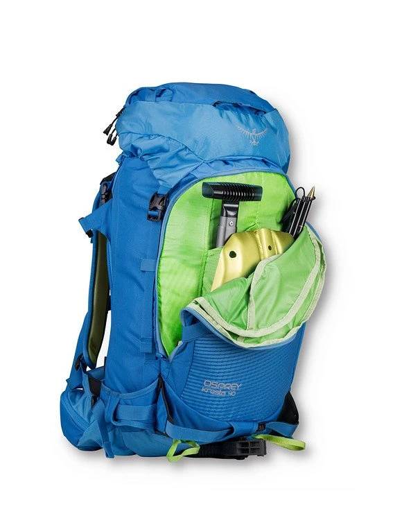 A quick-access extended J-zipper with an extra-large opening provides access to avalanche safety gear secured inside the pack. An easy-to-find third zipper pull allows rapid access if a helmet, skis or snowboard are being carried on the pack. The large pockets accommodate large shovel blades and the dual center sleeves secure extra-long probes and shovel handles.