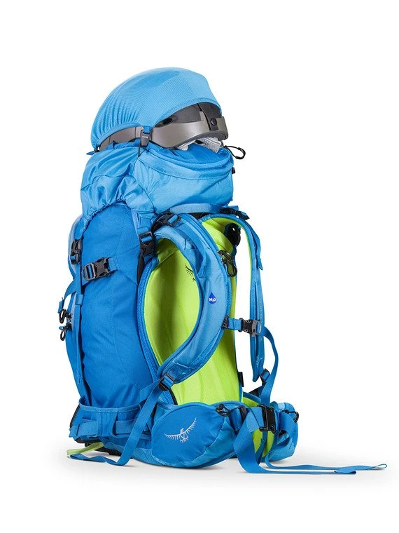 Dual-position, deployable helmet net quickly and securely stows helmets for a comfortable ascent. The helmet carry can be deployed to the front panel or top of the pack as to not block the preferred ski- or snowboard-carry options.