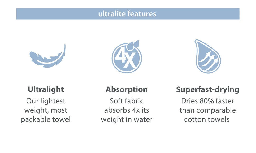 - Ultralight: Even in its largest size, the UltraLite towel barely tips the scales at just 5.1 oz.