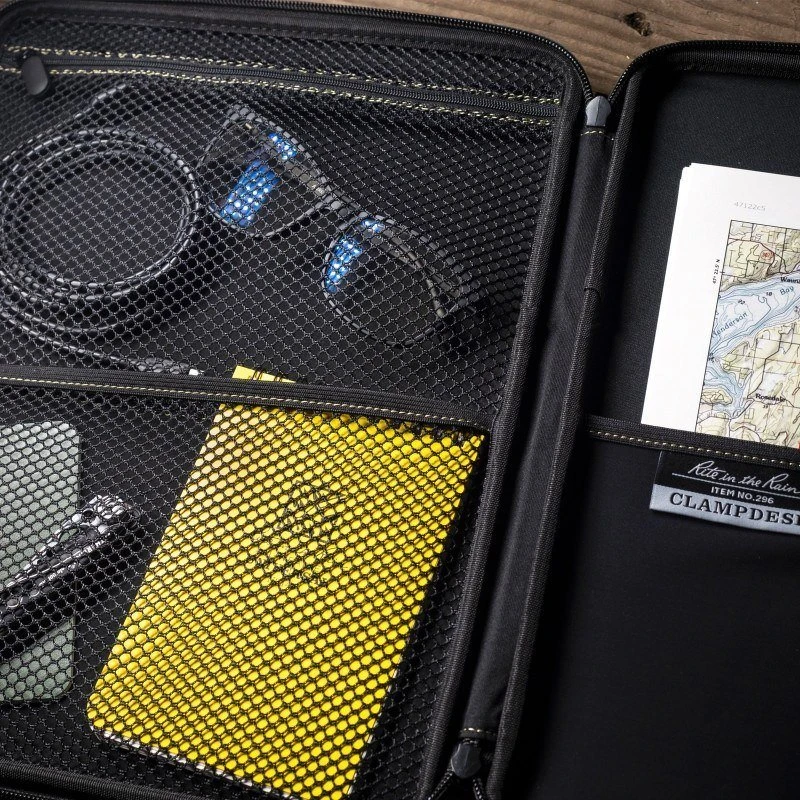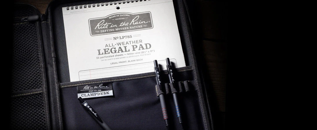 - Weatherproof dual zippers, front and back writing surfaces, rust resistant clamp