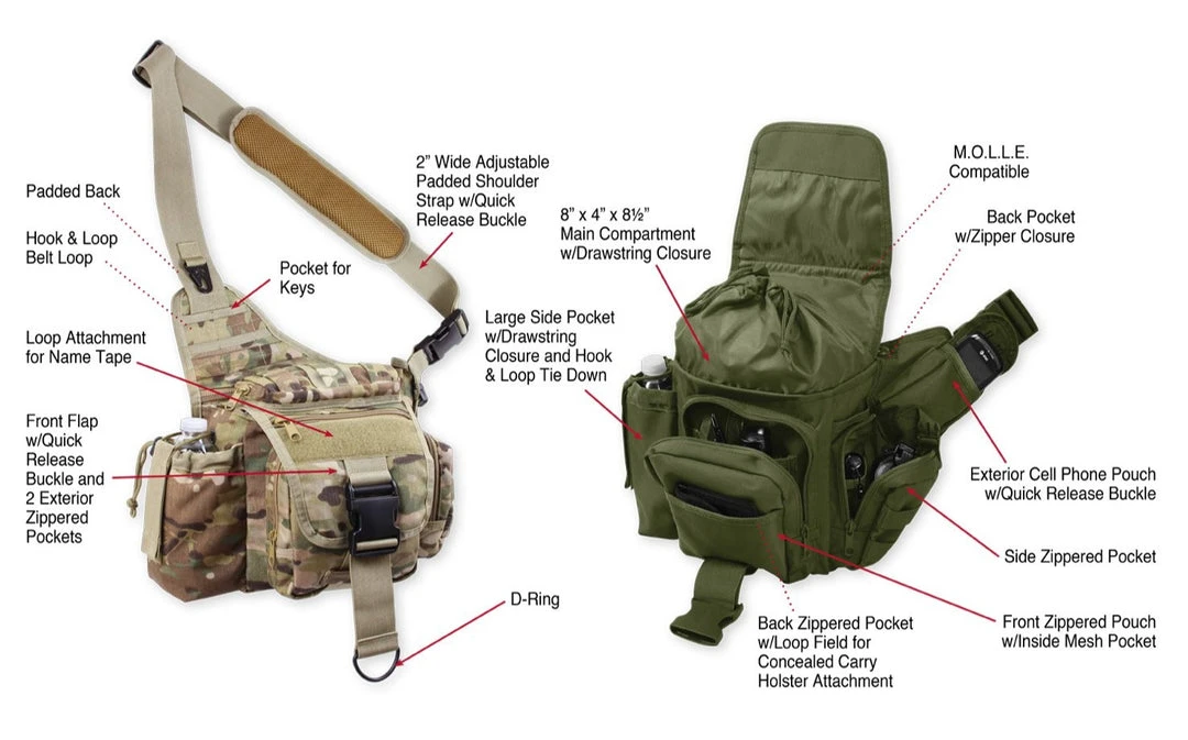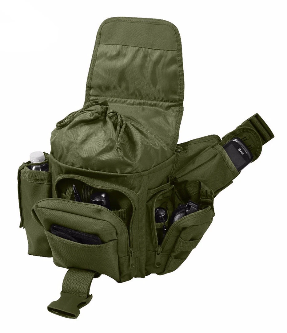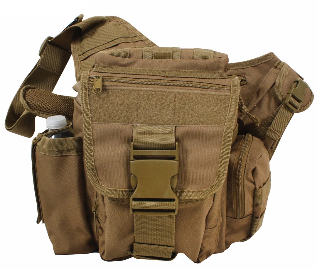Rothco’s Advanced Tactical Bag is made of durable denier polyester and has multiple versatile pouches for maximum storage making it an ideal every day Carry (EDC) bag. This MOLLE compatible tactical shoulder bag features a small zippered side pouch, large side pouch with drawstring closure, two exterior zippered pockets, two inside pockets in the main compartment, and an exterior cell phone pouch. Front flap closure with quick release buckle is designed to keep the contents of the survival bag secure. A 2” wide adjustable padded shoulder strap with a quick release buckle and a three padded back area are included on the tactical bag for added comfort.