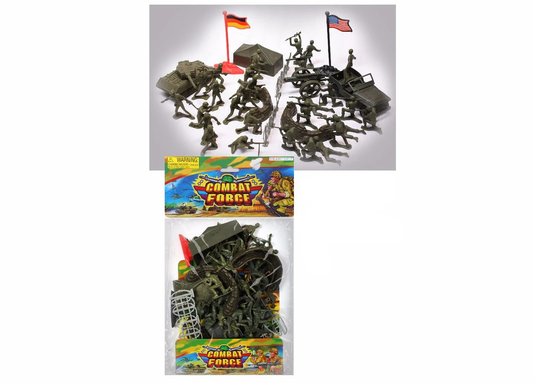 A classic military toy play set that includes 28 soldiers, 1 tent,1 tan military jeep, 1 cannon, 2 sandbag barriers, 2 barbwire fences and 2 flags with stands. For ages 3 and up.