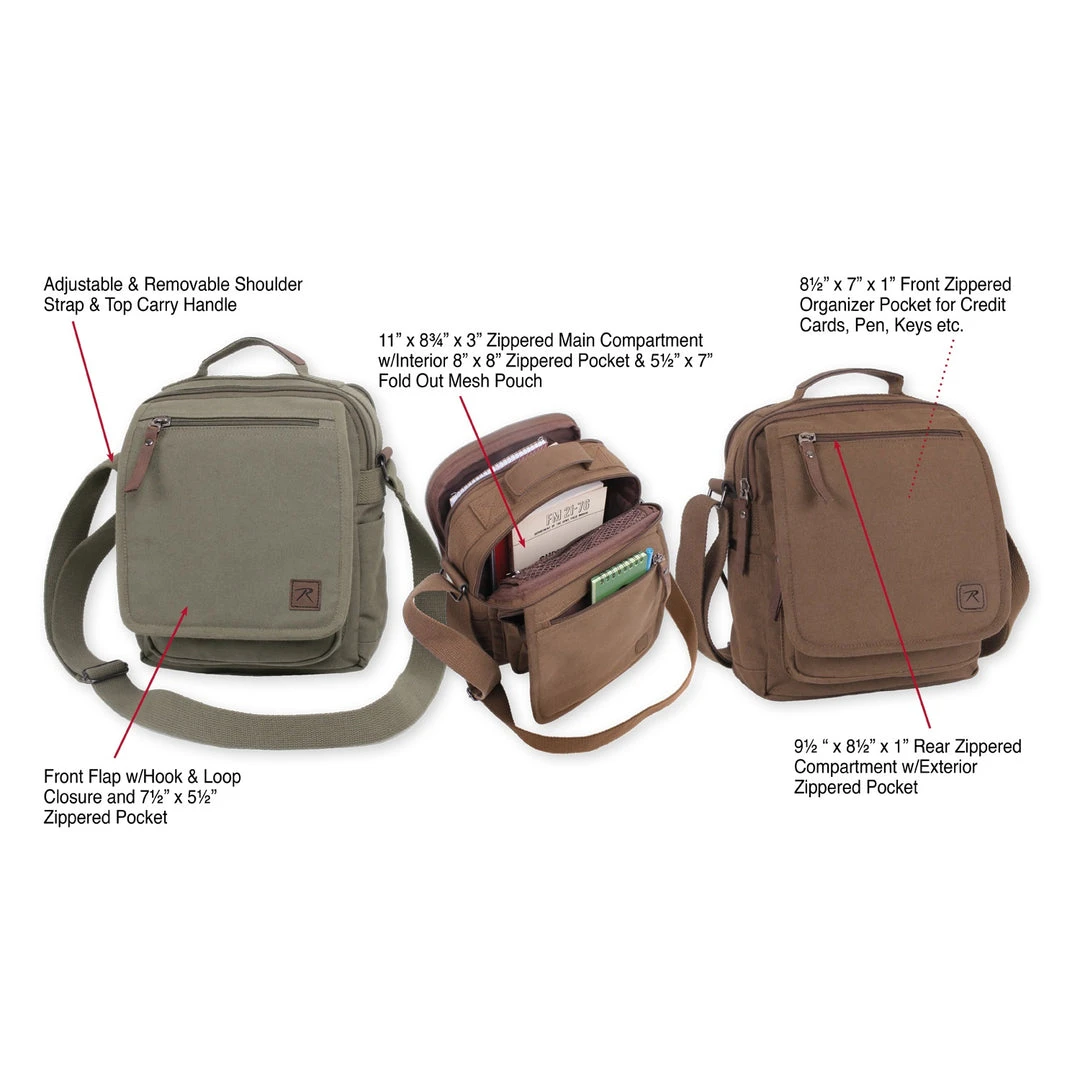 Rothco’s Everyday Work Shoulder Bag will keep you organized on the go! The heavyweight cotton canvas bag measures 8 3/4″ x 5″ x 11″ and features genuine leather accents, an adjustable and removable shoulder strap, and a top carry handle. Rothco’s shoulder bag has several organizational and storage compartments perfect for holding all of your gear.