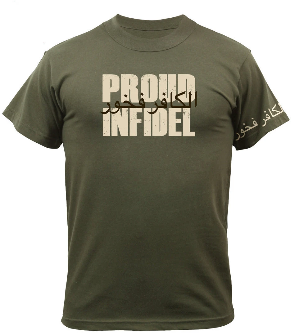Rothco’s graphic t-shirt features an Infidel logo with corresponding text “Proud Infidel”. Printing on the left shoulder also displays the Infidel logo.
