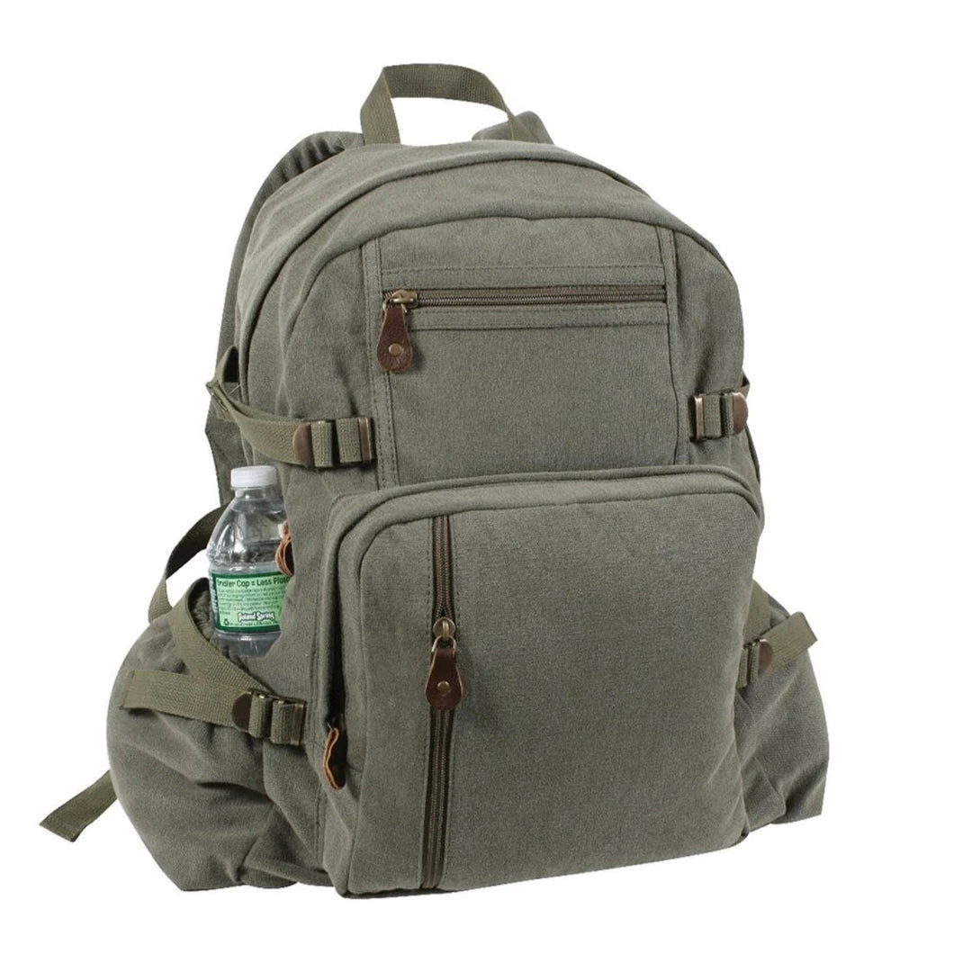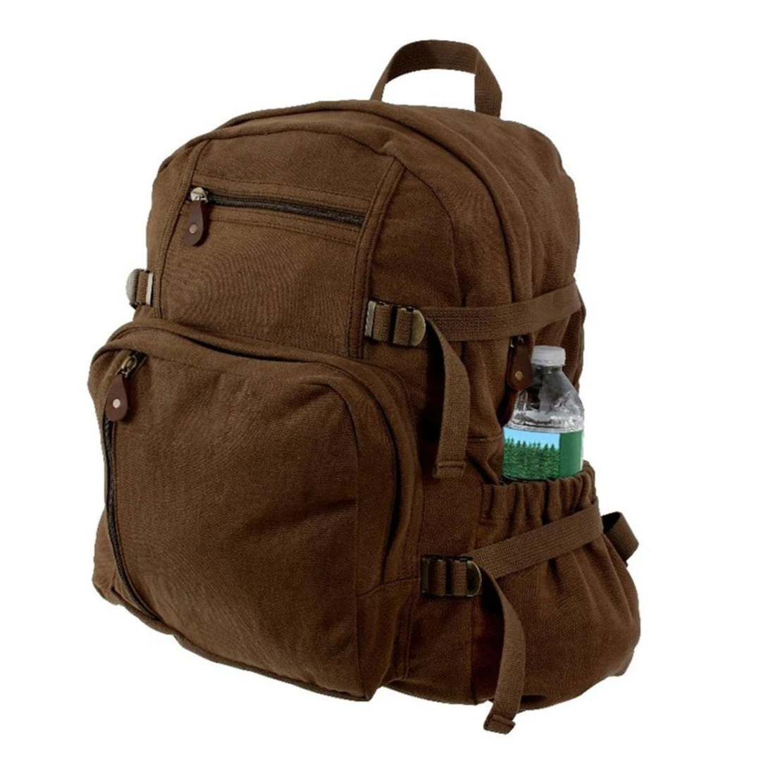 Rothco’s Jumbo Vintage Canvas Backpack is a classic backpack constructed with a vintage washed cotton canvas material. The pack features 1 large main compartment ideal for books & supplies, 3 outside zippered pouches & 2 elastic side pockets with tie down straps, great for accessories and water bottles. In addition, the canvas bag also features padded adjustable shoulder straps and a top carry handle. Rothco’s Jumbo Canvas Backpack measures 18″ x 13.5″ x 7″. Rothco also offers a more compact version of this backpack as well.