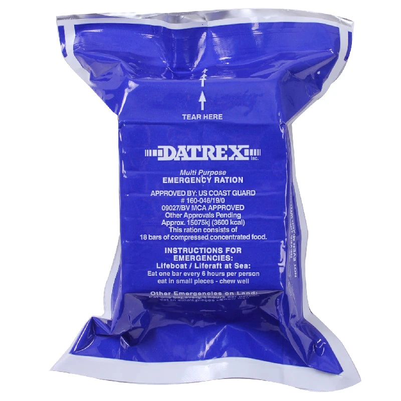 The Datrex Blue 3600 Calorie Emergency Food Ration is 18 coconut flavored bars, 200 calories per bar, 5 year shelf life, US coast guard approved. Good for survival or camping.