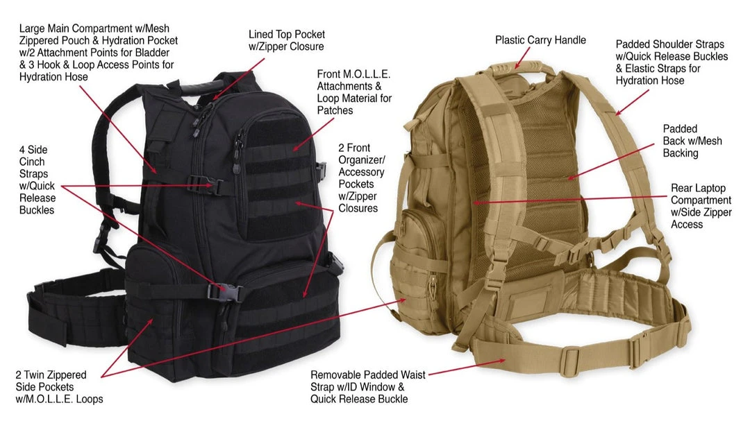 - 20” X 16” X 10 ½” Polyester MOLLE Assault Pack Includes Over 7 Storage Compartments / Pockets