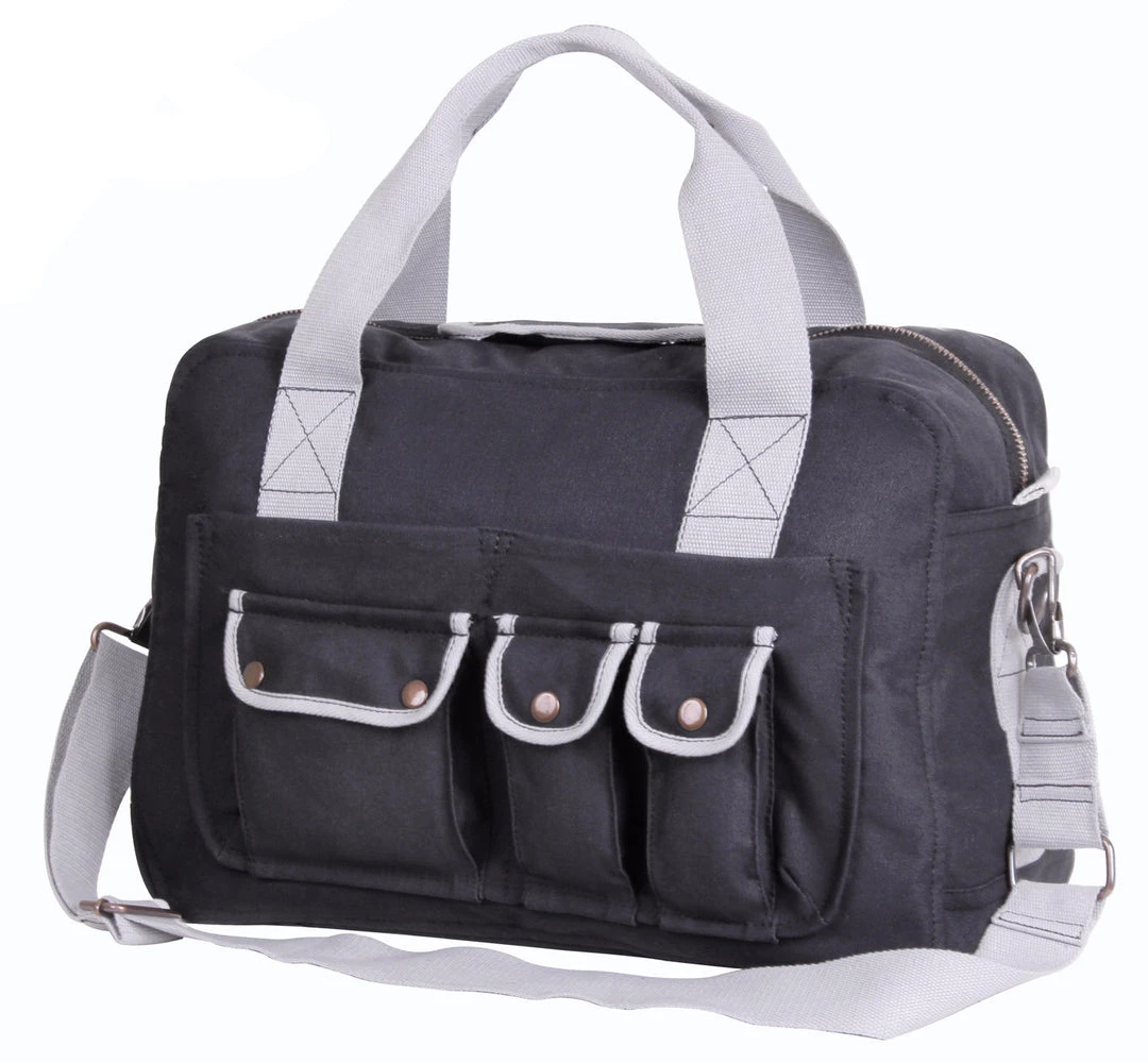 Rothco’s Two-Tone Specialist Carry All Shoulder Bag is constructed with a durable heavyweight cotton canvas, with two-tone accent canvas trim. The shoulder bag features tons of compartments great for storage; one large compartment with an inside pouch makes storing larger gear easy, 2 front pockets with 3 exterior snap pockets for smaller gear and tools, and two back pockets. Rothco’s canvas bag can be carried by either the adjustable shoulder strap or carry handles.