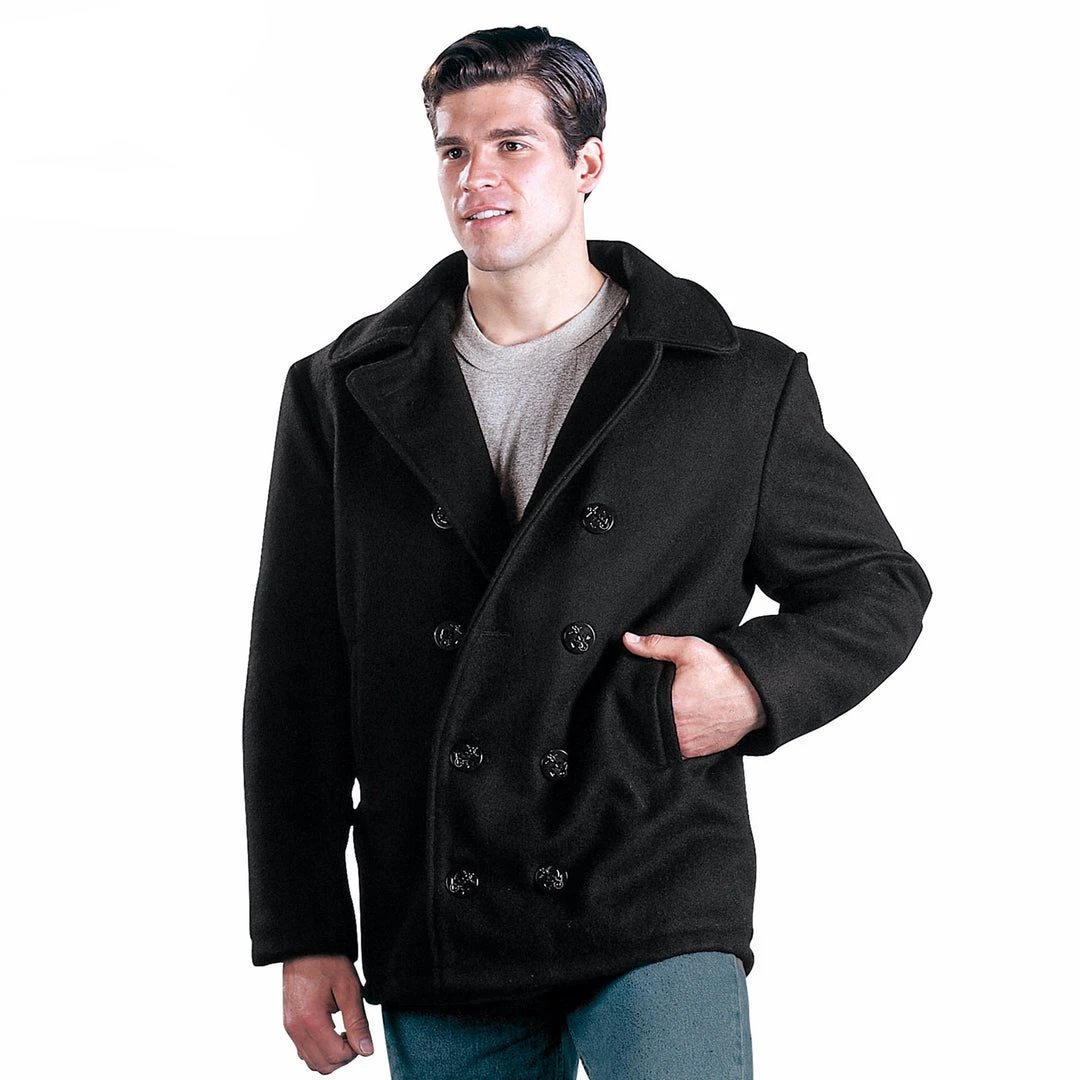 A pea coat (or pea jacket, pilot jacket) is an outer coat, generally of a navy-coloured heavy wool, originally worn by sailors of European and later American navies. Pea coats are characterized by short length, broad lapels, double-breasted fronts, often large wooden, metal or plastic buttons, and vertical or slash pockets. References to the pea jacket appear in American newspapers at least as early as the 1720s and modern renditions still maintain the original design and composition