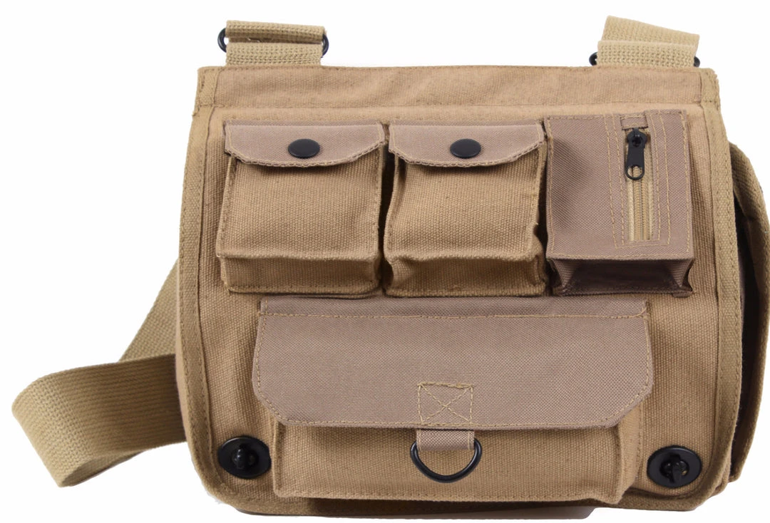 Rothco’s Venturer Survivor Shoulder Bag features a heavyweight Canvas outer and water repellent Nylon interior, a heavy duty adjustable canvas strap and GI latching buckle. The bag also features 2 internal compartments with 4 additional organizational pockets, a rear pocket, side phone pouch and 4 flip up front pouches. The bag measures 10″ x 11″ x 5″ with a 54″ fully extended shoulder strap.