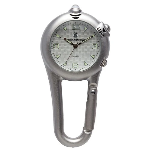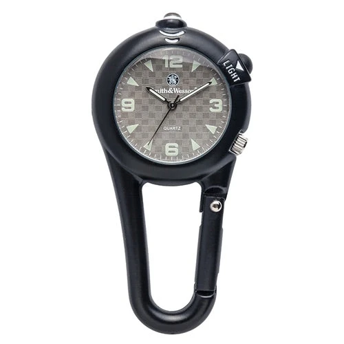 The Smith & Wesson Water Resistant Carabineer Pocket Watch keeps track of time with unrivaled precision and has a powerful LED task light to find things in the dark. This timepiece has an hour, minute and seconds hand with a day display and comes with a carabineer clip to attach to your belt loop, backpack or keychain. This watch is an absolute must in the emergency, safety and protection sectors as well as in the armed forced but it’s also ideal for adventure sports. The back is made of stainless steel and the watch has a black finish. The Smith & Wesson SWW-36-BLK Water Resistant Carabineer Pocket Watch comes with a 1-year limited warranty that protects against defects in material and workmanship. Smith & Wesson prides itself in designing and manufacturing innovative solutions that are unparalleled in the field of personal safety and protection. Most major law enforcement and military agencies in the world use Smith & Wesson products. Smith & Wesson products enhance public safety, security and protection all over the world.