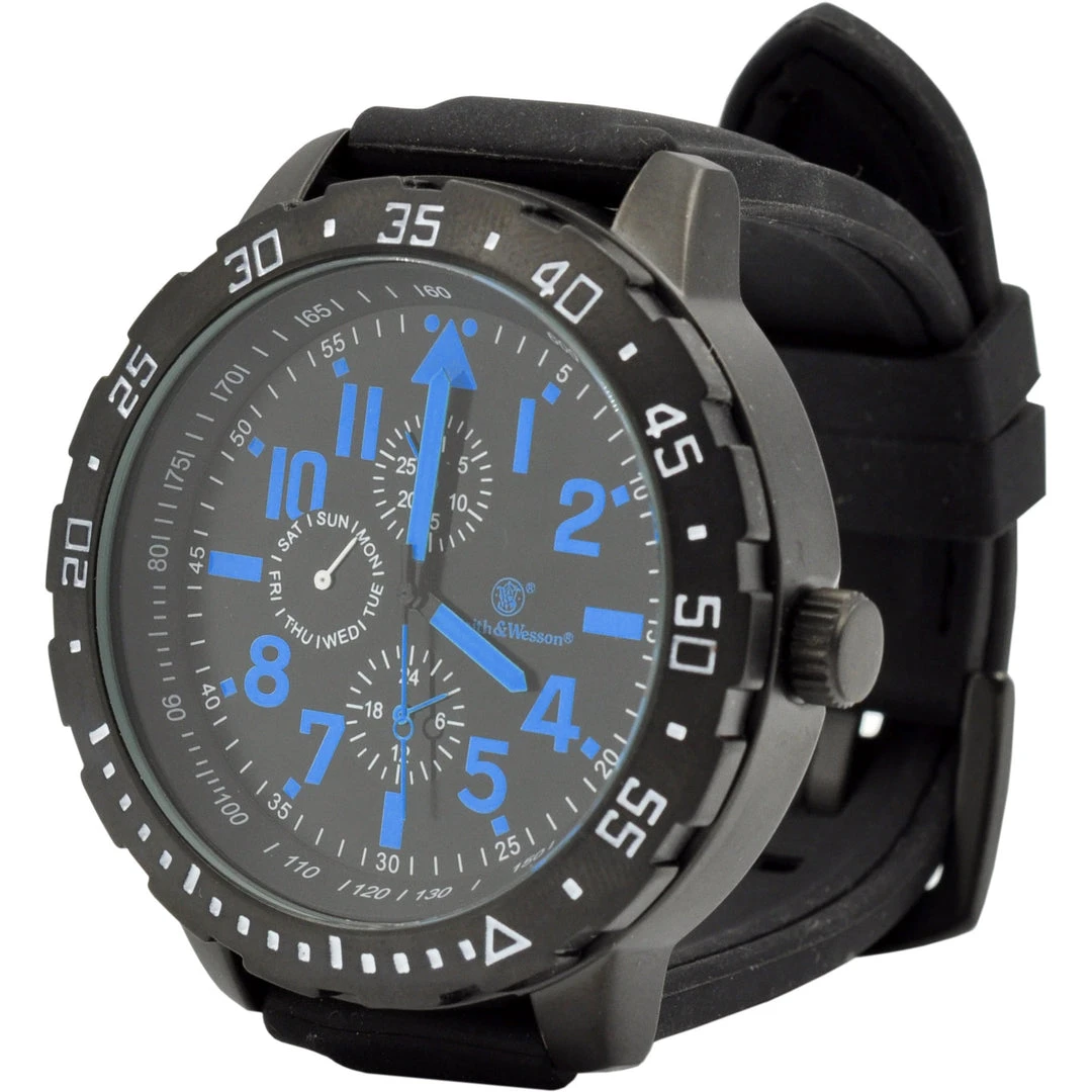 Slide your hand into the bold style and sophistication of the Smith & Wesson Calibrator Watch that features a round black face with large blue numbers and hands and a black rubber wristband with blue stitching. Crafted with all the precision and reliability that’s made Smith & Wesson a staple in the law enforcement community, with a look and feel befitting all your off-the-clock escapades!