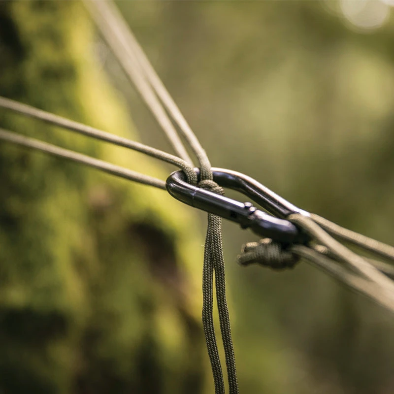 Suspension Attachment System: Made out of 550 paracord with knots spaced to allow for various attachment points and distances from the tree or post to the hammock. No more fumbling and tying knots, nor finding the perfectly spaced tree as the Suspension Attachment System allows for various lengths to attach the hammock as required. Simply wrap the Suspension Attachment System around the desired tree then run the knotted end through the loop end and attach the carabiner on the hammock to the knotted section to achieve the desired length and height when setting up.