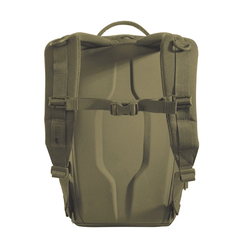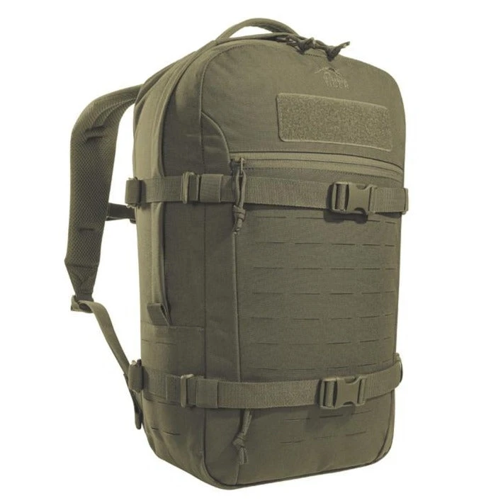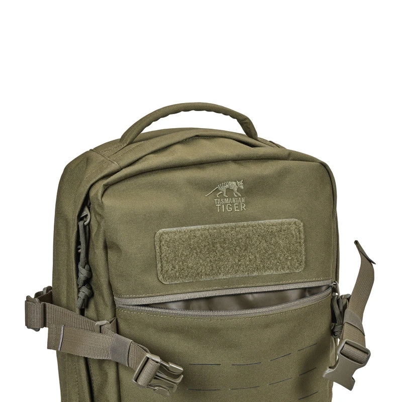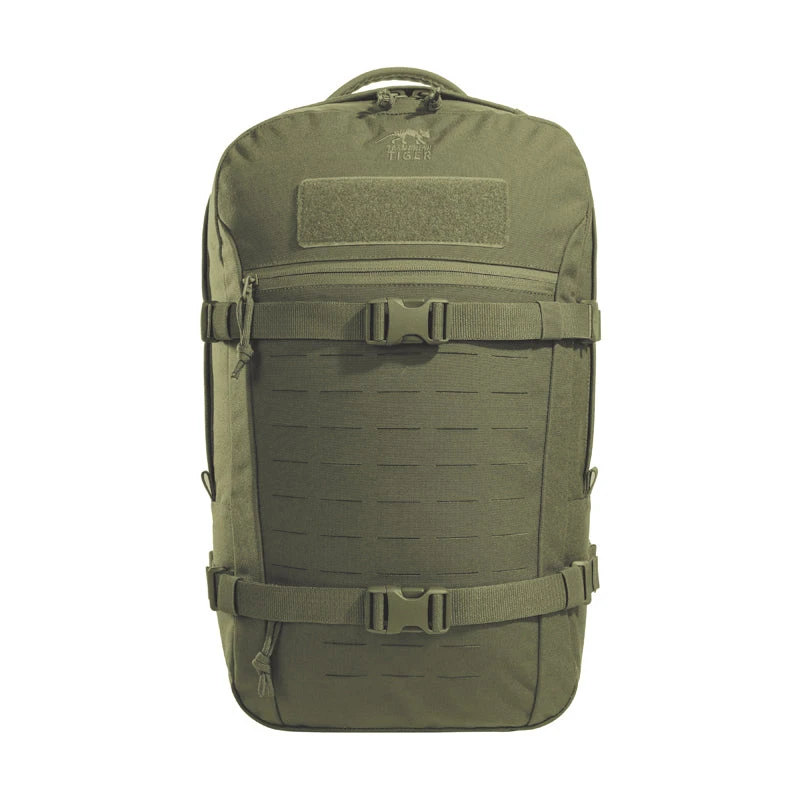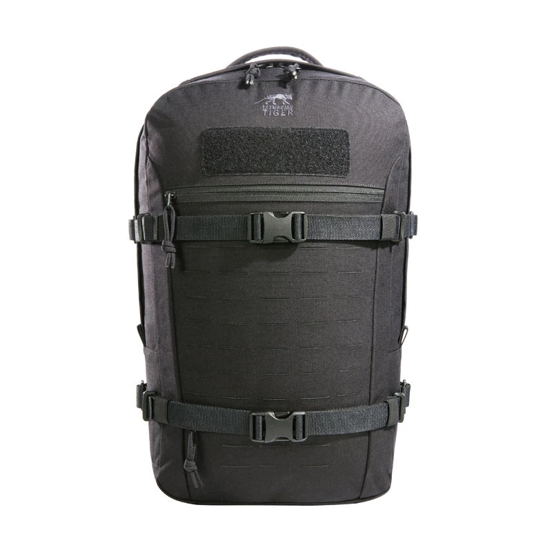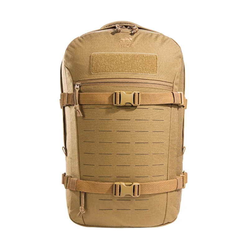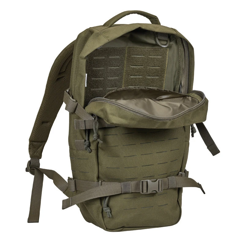 Modular daypack with 23 liters of Volume. The backside of the main compartment of the daypack is lined with MOLLE hook panels for attaching compatible loop pouches. It is also designed to hold a 15.4″ laptop. The flat zipper front pocket is great for documents while the laser-cut MOLLE on the front and sides allow you to add gear to suit your needs.