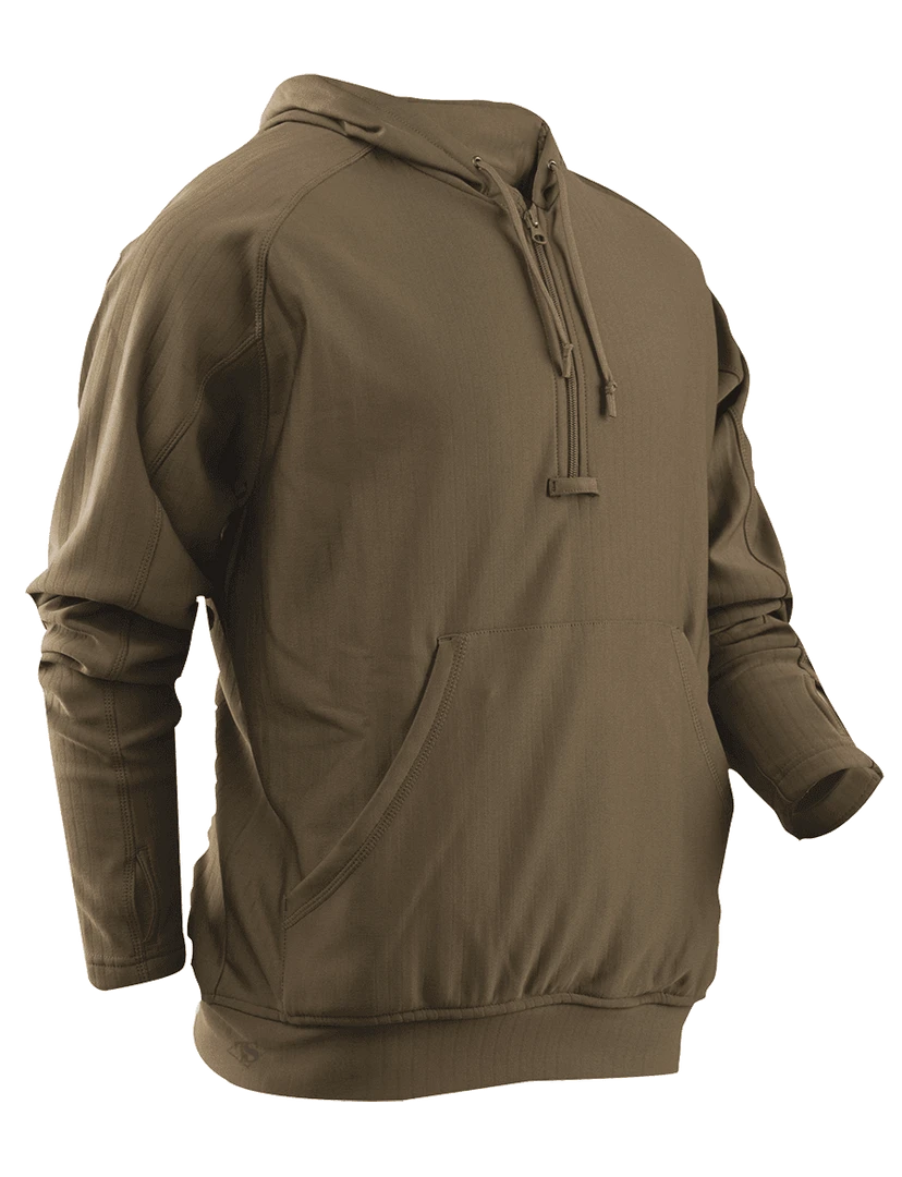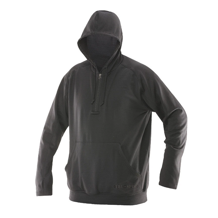 Who doesn’t love a nice warm hoodie on a cool day? This mid-weight pullover style hoodie is just the answer when there is a chill in the air. Constructed from plaited grid jersey knit 94% polyester 6% Spandex fabric with a 1/4 zip front zipper and front kangaroo pocket.